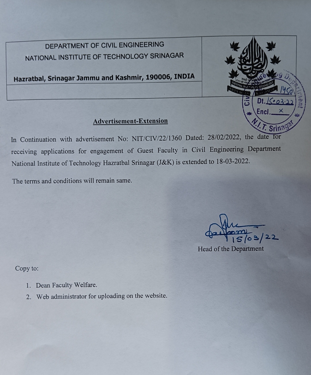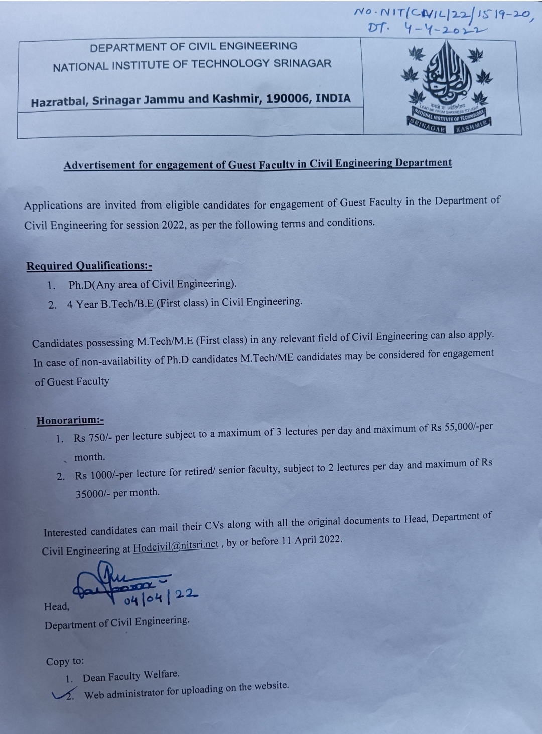 | Advertisement for Engagement of Guest Faculty in Civil Engineering Department - Extension Notice |